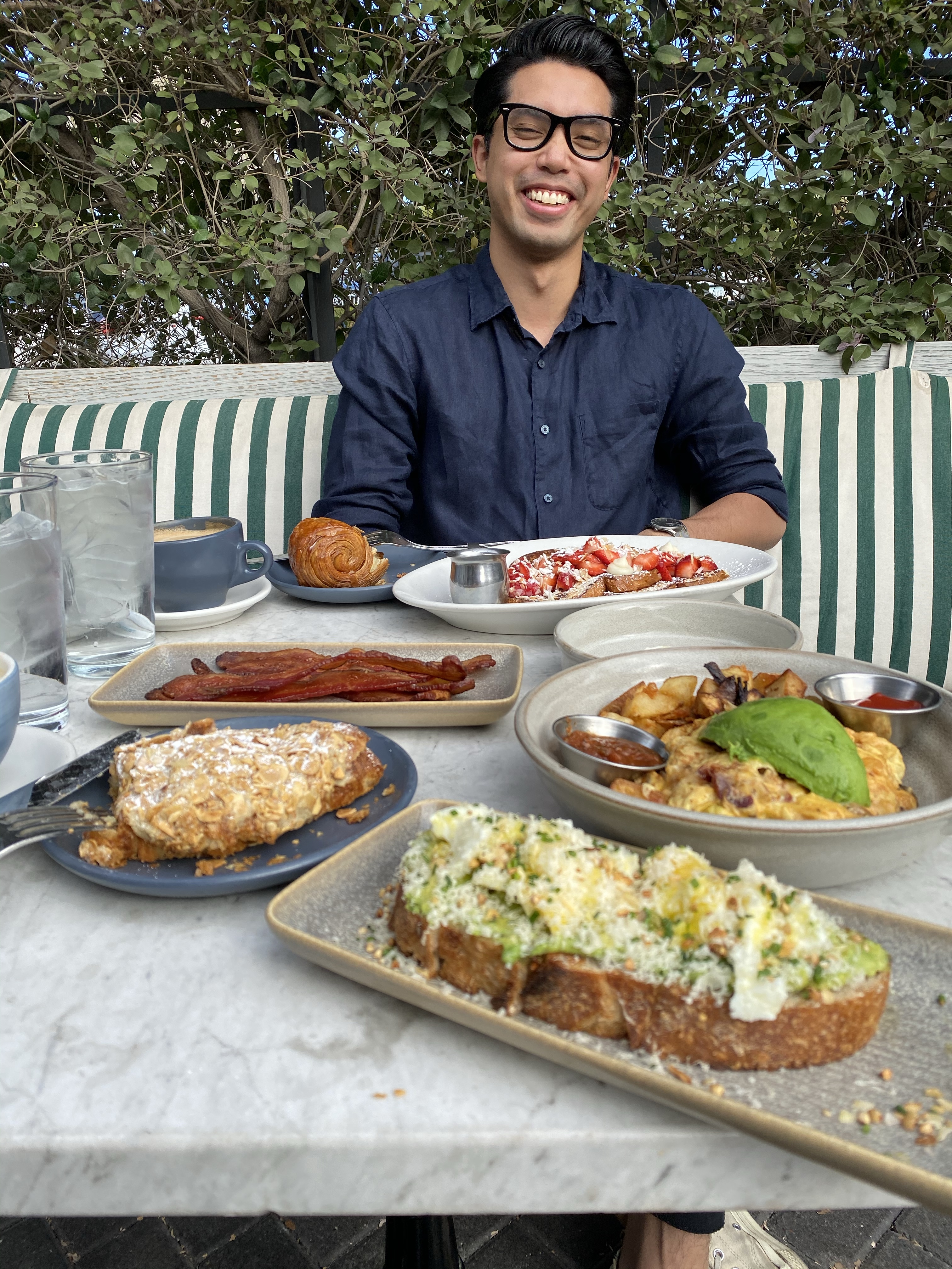 Brunch menu: aperol and Yuzu cocktail, pancakes, burrito bowl, avocado toast, side of bacon, almost croissant, sticky bun and coffee.
